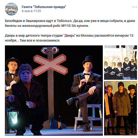 Народный коллектив театр-студия «Дверь» получил приглашение выступить со спектаклем «Большая меховая папа» в старейшем театре Сибири, которому более 300-лет, от Тобольского государственного драматического театра имени П.П.Ершова (http://tobteatr.kto72.ru/).
