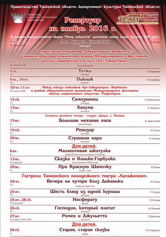 Для сведения: в июле этого года Тобольский театр (в котором будет показан спектакль "Большая меховая папа") посетил Театр наций Евгения Миронова с труппой и Чулпан Хаматовой (ТВ сюжет - http://tvkultura.ru/article/show/article_id/153852/)