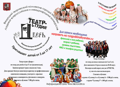 Театр-студия «Дверь» - это театр для детей от 5 до 17 лет (включительно). Дети занимаются 4 раза в неделю по 2 часа. Дети проходят богатую сценическую практику на профессиональных сценических площадках , участвуют в  серьезных театральных и кино проектах, фестивалях и конкурсах,