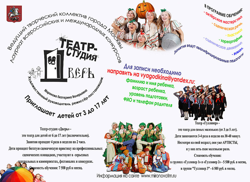 Ведущий творческий коллектив города Москвы "Театр-студия "Дверь" и театр "Гулливер" Лауреат всероссийских и международных конкурсов Художественный руководитель, режиссёр постановщик – Миронова Екатерина Валерьевна