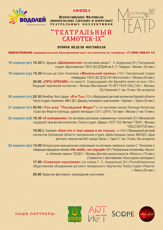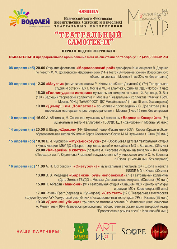 Огромная просьба к родителям участников спектакля заранее объяснить детям правила поведения в театре. У нас в кулисах с двух сторон лестницы на балкон- категорически нельзя туда подниматься. Если организаторы видят, что дети создают опасность для своей жизни и здоровья- они вынуждены будут принимать меры вплоть до удаления данного участника, мы просим понимания в этом вопросе. Также нельзя заходить в другие кабинеты и помещения, костюмерные и т п, куда не приглашался коллектив. Театр маленький, и где- то могут идти занятия. Также просим заранее предупредить ребят, что мы рады, что они веселые и энергичные, но, если они будут бегать и кричать – будет сложно работать и им, и нам, и тем, кто в это время работает в помещении и не имеет отношения к фестивалю.