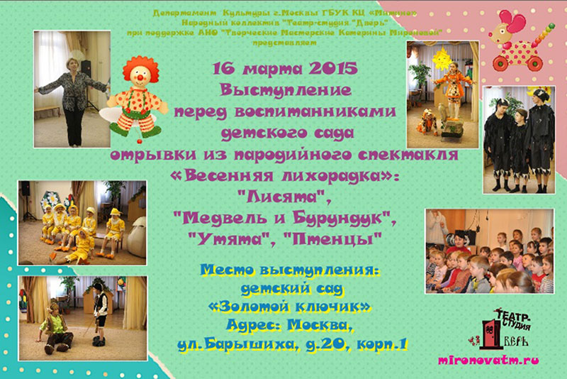 Комментарий: Весной ходили на спектакль "Весенняя лихорадка". Очень понравилось. В спектакле задействованы дети всех возрастов от самых маленьких до взрослых артистов. Шикарная музыка и отличный сюжет. Рекомендую!