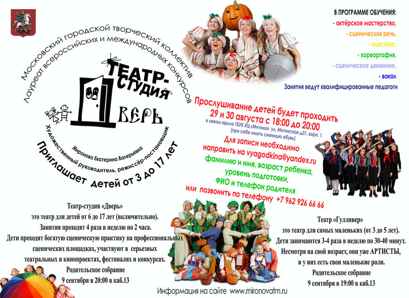 Миронова Екатерина Валерьевна. Приглашает на конкурсной основе детей от 3-17 лет Прослушивание детей будет проходить 29 и 30 августа с 18:00 до 20:00