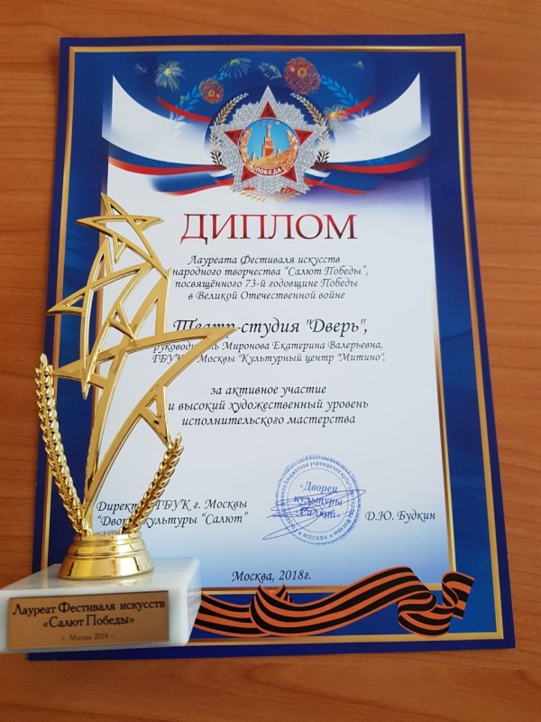 Театр-студия "Дверь" принял участие в Окружного фестиваля искусств и народного творчества "Салют победы", посвященный Победе в Великой Отечественной войне 1941 - 1945 гг., в номинациях: