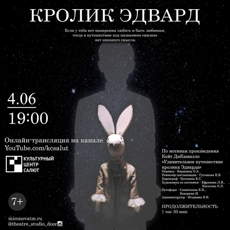4 июня в 19:00 состоится показ спектакля "Кролик Эдвард" в ДК Салют - онлайн-показ