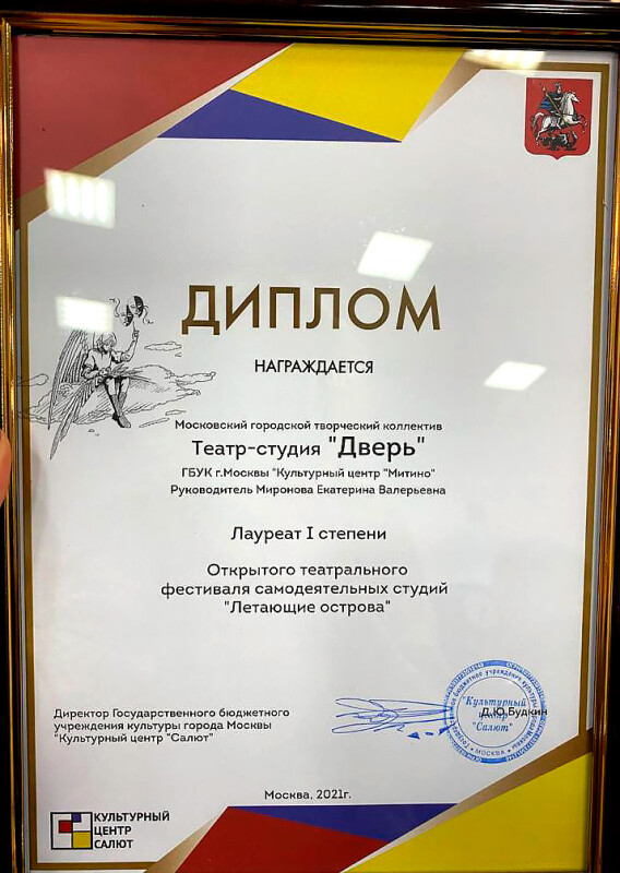 Московский городской творческий коллектив "Театр-студия "Дверь" участвовал в в Открытом театральном фестивале самодеятельных студий "Летающие острова" 2021 г., который проходил в ГБУК г.Москвы "КЦ "Салют" (зал "Восход") по адресу: Москва, ул.Свободы, д.37, с отрывком из спектакля-комедии "Сказки про любовь, дураков и королей".