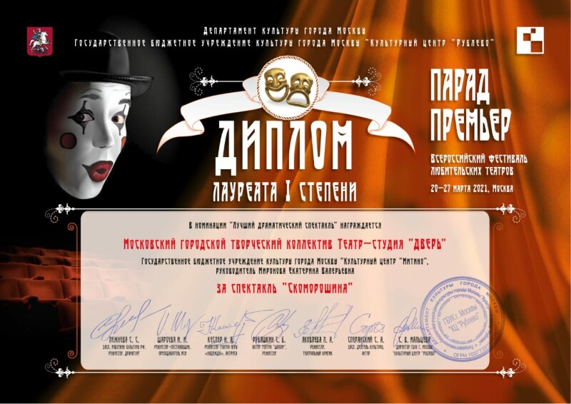 Московский городской творческий коллектив "Театр-студия "Дверь" участвовал во Всероссийском театральном фестивале детских, юношеских, семейных, молодёжных театров, театров – студий и драматических коллективов "Парад Премьер 2021", который проходил в ГБУК г.Москвы "КЦ "Рублево", со спектаклем "Скоморошина" (по мотивам повести Н.В. Гоголя «Вечера на хуторе близ Диканьки»).