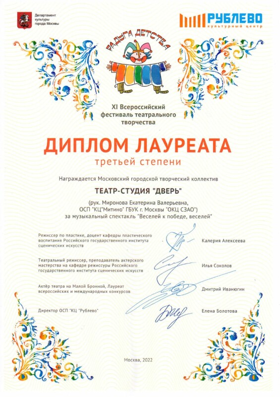 Московский городской творческий коллектив "Театр-студия "Дверь" участвовал в XI Всероссийском фестивале театрального творчества «Радуга детства», который проходил в Культурном центе "Рублево". Конкурсный отбор прошли 25 театральных коллективов, которые участвовали в финальном этапе конкурса.
