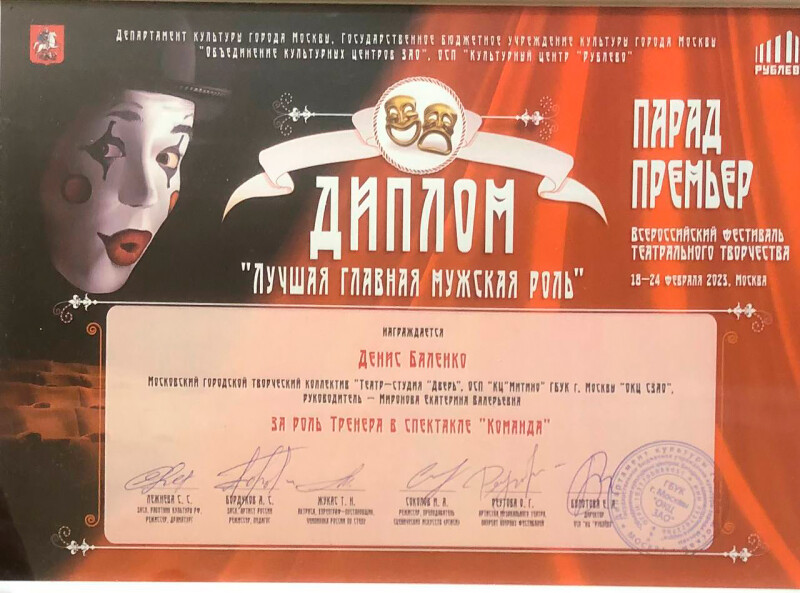Отдельное поздравление Баленко Денису, который удостоен персональным дипломом "Лучшая главная мужская роль" за роль тренера в спектакле "Команда".