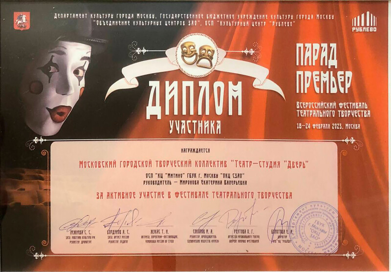 Поздравляем с успешным выступлением юниоров на Всероссийском фестивале-конкурсе театров, театров - студий и драматических коллективов «Парад Премьер 2023», проходившем феврале 2023 г. в КЦ "Рублево".