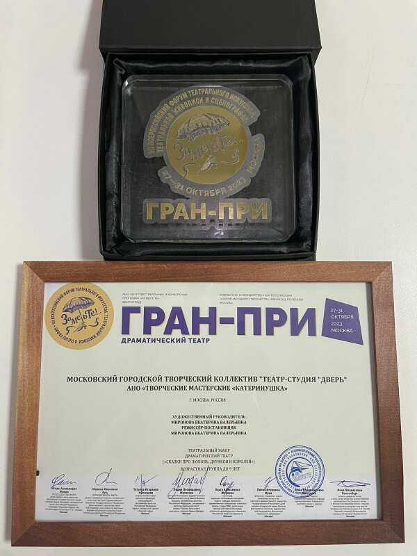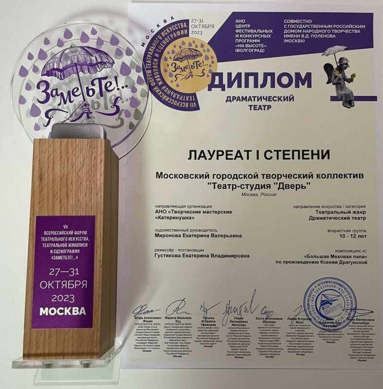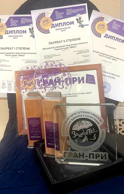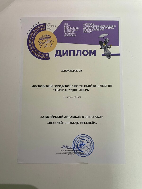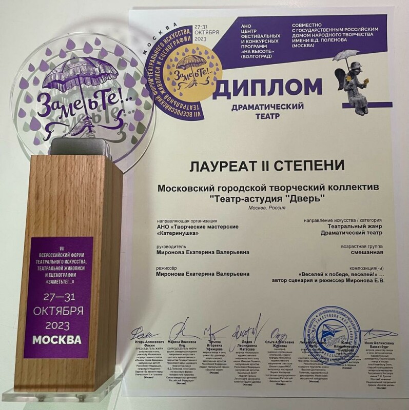 29 октября коллектив Московского городского творческого коллектива «Театр-студии “Дверь”» успешно выступил в рамках VII Всероссийского форума театрального искусства «Заметьте!..». Члены жюри фестиваля высоко оценили работу педагогов и студийцев, актерский талант и вокальные данные и наградили: