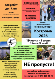 "Сосновый бор" 19 июня - 1 июля 2026 г. Приглашаем принять участие в летней творческой смене с театром «Дверь»! Летний творческий лагерь в лесном массиве Костромской области на берегу реки Кубань. Набирается группа дети и взрослые с детьми (не более 60 человек)