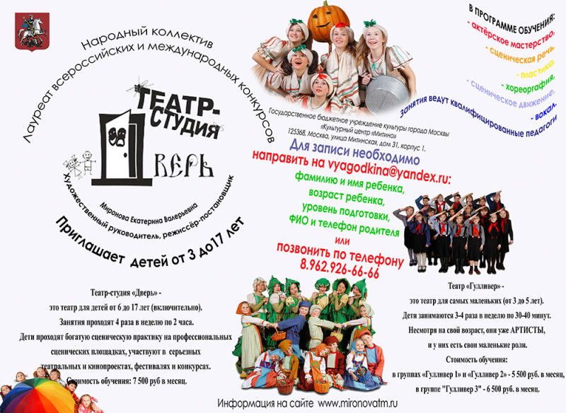 Театр-студия «Дверь» - это театр для детей от 6 до 17 лет (включительно). Дети занимаются 4 раза в неделю по 2 часа. Дети проходят богатую сценическую практику на профессиональных сценических площадках, участвуют в серьезных театральных и кинопроектах, фестивалях и конкурсах. Стоимость обучения: 7 500 руб.