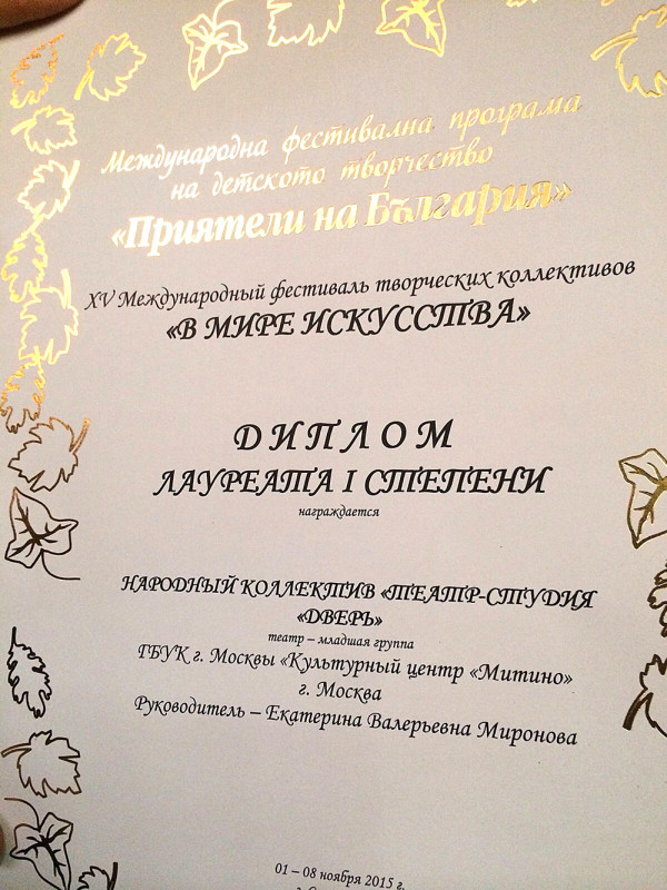 Поздравляем участников XV Международного фестиваля творческих коллективов «В мире искусства» Международной фестивальной программы детского творчества «Друзья Болгарии», который проходил в этом году в городе Сочи, а также их родителей и педагогов Народного коллектива "Театр-студия "Дверь" с ПОБЕДОЙ на фестивале. Молодцы!!!