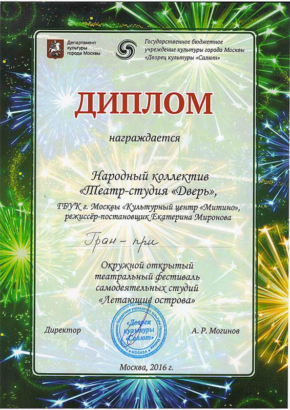 Поздравляем участников спектакля-комедии "Сказки про любовь, дураков и королей" (состав - Младшая 1), а также их родителей и педагогов Народного коллектива "Театр-студия "Дверь" с получением ГРАН-ПРИ на Окружном открытом театральном фестивале самодеятельных студий "Летающие острова". Молодцы!!!